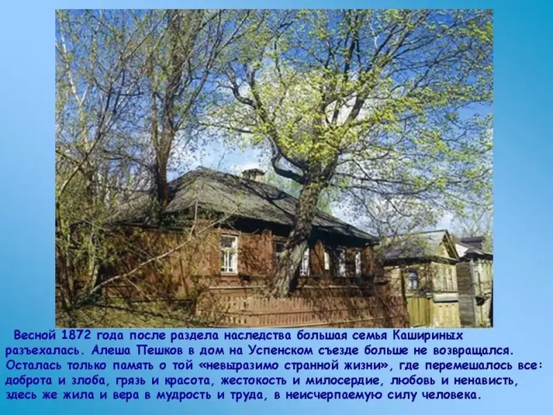 Весной 1872 года после раздела наследства большая семья Кашириных разъехалась. Алеша Пешков в дом на Успенском съезде больше не возвращался. Осталась только память о той "невыразимо странной жизни", где перемешалось все: доброта и злоба, грязь и красота, жестокость и милосердие, любовь и ненависть, здесь же жила и вера в мудрость и труда, в неисчерпаемую силу человека: "Здесь смеялись мало, и не всегда было ясно, над чем смеются. Часто кричали друг на друга, грозили чем-то один другому, тайно шептались в углах. Дети были тихи, незаметны; они были прибиты к земле, как пыль дождём. Я чувствовал себя чужим в доме, и вся эта жизнь возбуждала меня десятками уколов, настраивая подозрительно, заставляя присматриваться ко всему с напряжённым вниманием". (Максим Горький, "Детство".)