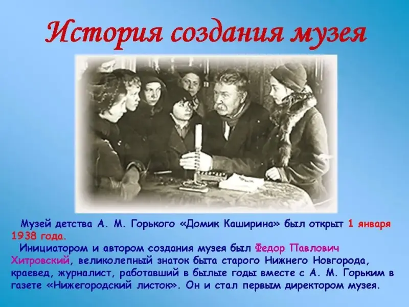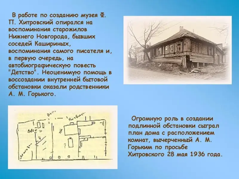 В 1936 году он приступил к реставрации полуразрушенного дома, который к тому времени, сменив несколько хозяев, полуразрушенный стоял среди поваленных заборов и старых сараев. В работе по созданию музея Ф. П. Хитровский опирался на воспоминания старожилов Нижнего Новгорода, бывших соседей Кашириных, воспоминания самого писателя и, в первую очередь, на автобиографическую повесть "Детство". Неоценимую помощь в воссоздании внутренней бытовой обстановки оказали родственники А. М. Горького: двоюродная сестра Екатерина Михайловна Каширина-Весовщикова (Катя по повести "Детство"), она хорошо помнила дом того времени; двоюродные братья Горького Константин и Сергей Михайлович, а также дальняя родственница Анна Кирилловна Заломова. Огромную роль в создании подлинной обстановки сыграл план дома с расположением комнат, вычерченный А. М. Горьким по просьбе Хитровского 28 мая 1936 года.