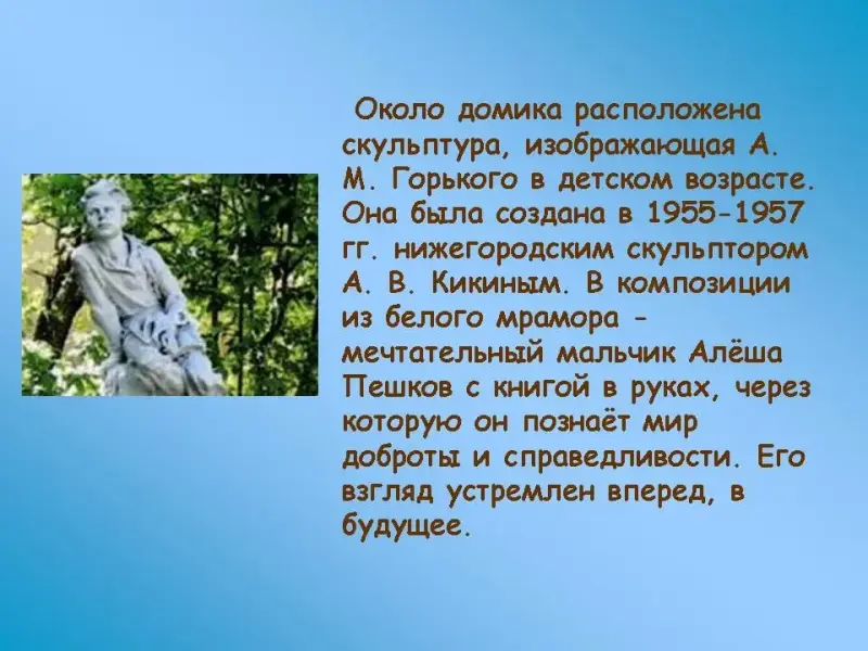 Около домика расположена скульптура, изображающая А. М. Горького в детском возрасте. Она была создана в 1955-1957 гг. нижегородским скульптором А. В. Кикиным. В композиции из белого мрамора - мечтательный мальчик Алёша Пешков с книгой в руках, через которую он познаёт мир доброты и справедливости. Его взгляд устремлен вперед, в будущее.