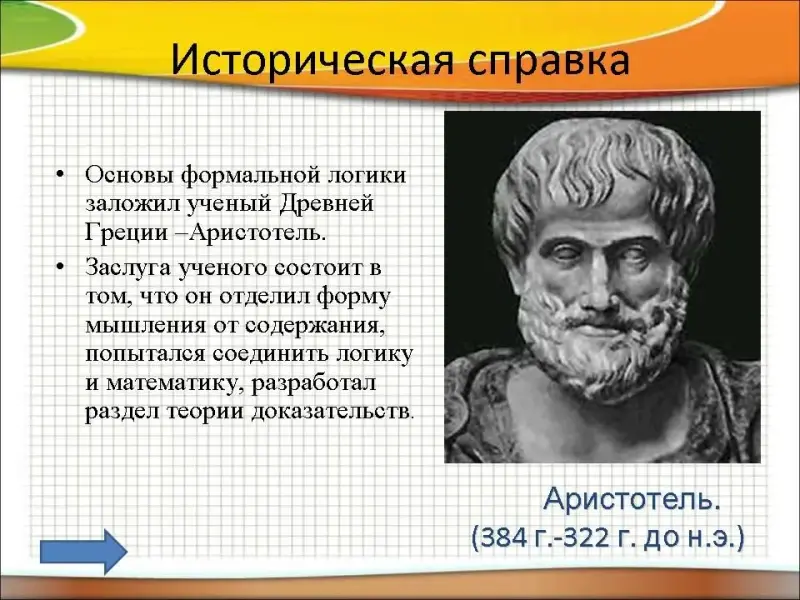 Основы формальной логики заложил ученый Древней Греции - Аристотель (384 г.-322 г. до н.э.) . Заслуга ученого состоит в том, что он отделил форму мышления от содержания, попытался соединить логику и математику, разработал раздел теории доказательств.