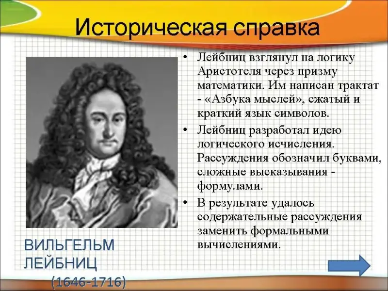 Немецкий ученый Лейбниц (1646-1716) взглянул на логику Аристотеля через призму математики. Им написан трактат - "Азбука мыслей", сжатый и краткий язык символов. Лейбниц разработал идею логического исчисления. Рассуждения обозначил буквами, сложные высказывания - формулами. В результате удалось содержательные рассуждения заменить формальными вычислениями.