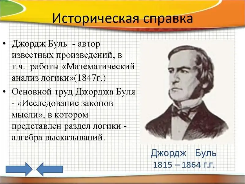 Джордж Буль считается основоположником математической логики как самостоятельной дисциплины. В его работах логика обрела свой алфавит, свою орфографию и грамматику. Буль - автор известных произведений, в т.ч. работы "Математический анализ логики"(1847г.). Основной труд Джорджа Буля - "Исследование законов мысли", в котором представлен раздел логики - алгебра высказываний.