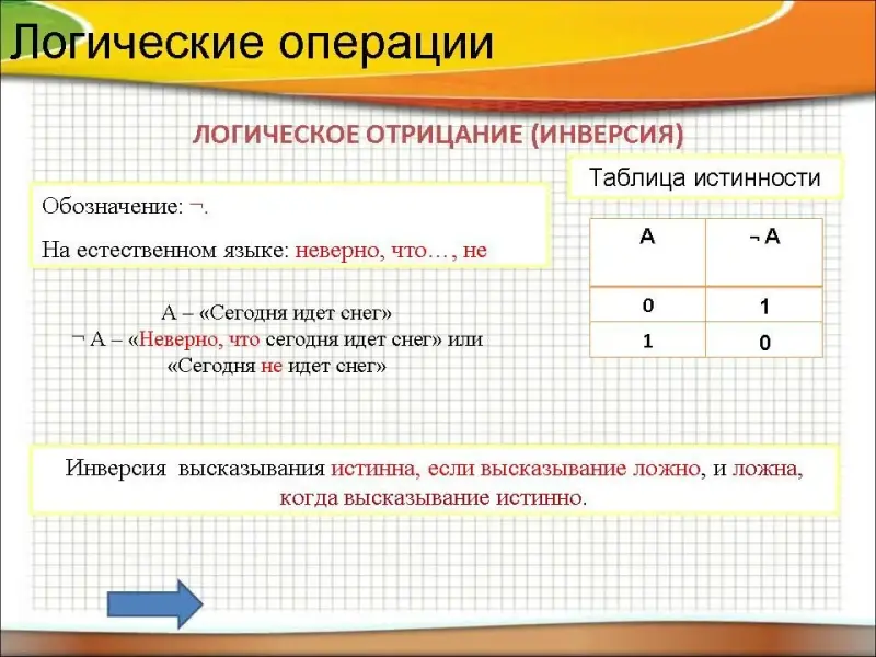 Таблица истинности логического отрицания
