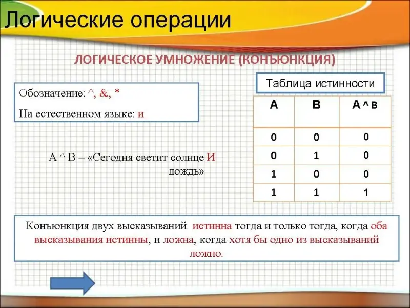 Конъюнкция двух высказываний истинна тогда и только тогда, когда оба высказывания истинны, и ложна, когда хотя бы одно из высказываний ложно.
