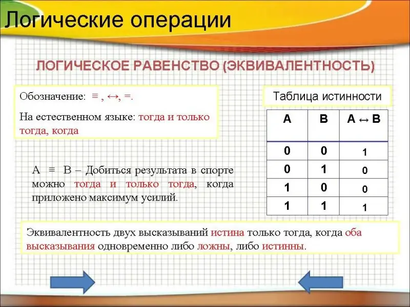 Таблица истинности логического равенства