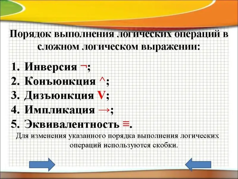Порядок выполнения логических операций в сложном логическом выражении:
