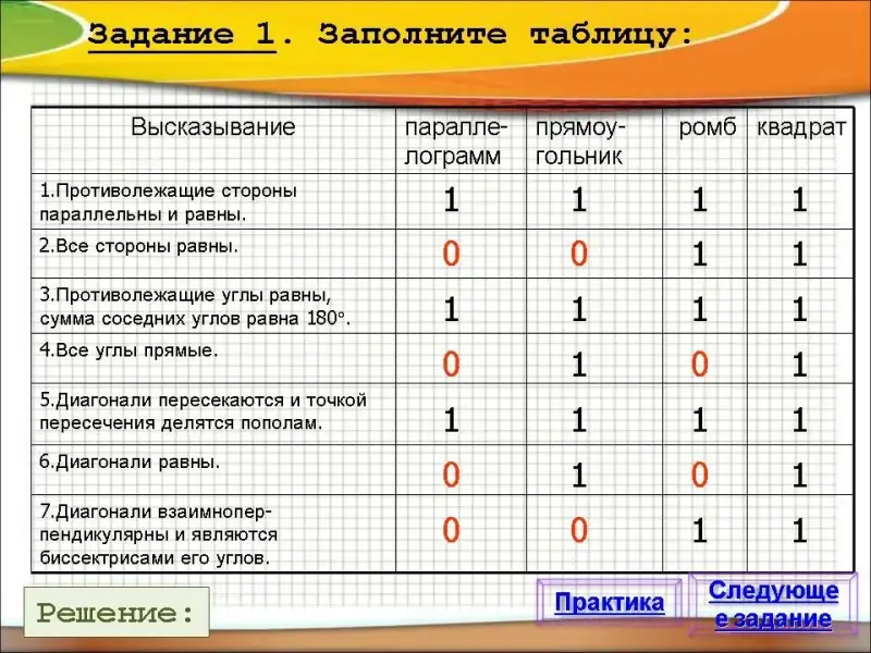 | Высказывание | параллелограмм | прямоугольник | ромб | квадрат |