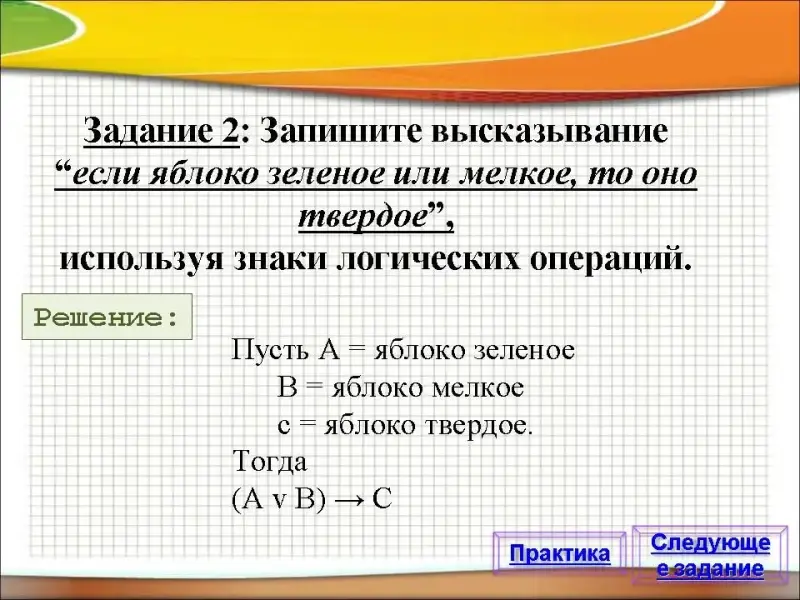 Задание 2: Запишите высказывание "если яблоко зеленое или мелкое, то оно твердое", используя знаки логических операций.