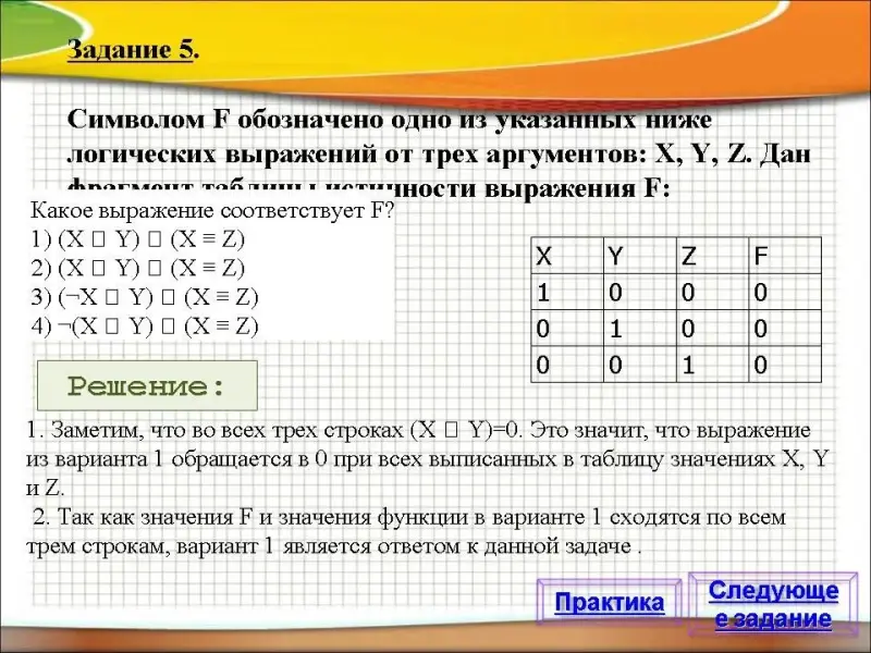 Задание 5. Символом F обозначено одно из указанных ниже логических выражений от трех аргументов: X, Y, Z. Дан фрагмент таблицы истинности выражения F: