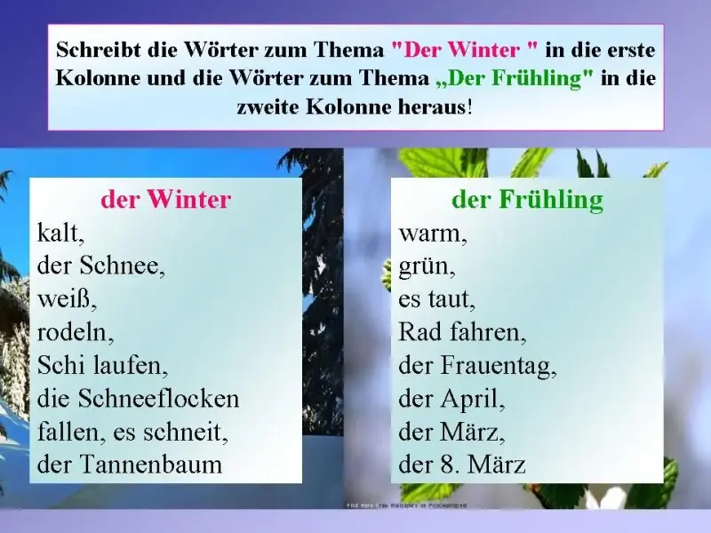 Wir wiederholen heute in der Stunde die Jahreszeiten, sprechen über das Wetter im Winter und erinnern uns an die Wochentagen.