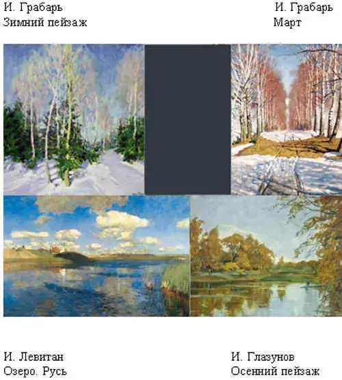 Учебники, карточки, раздаточный материал, иллюстрации русских художников (И. Глазунов, Ф. Грабарь, И. Левитан).