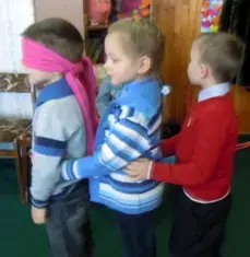 Дошкольникам предлагается двигаться с закрытыми глазами по игровому залу под детскую песенку "Кто придумал светофор?".