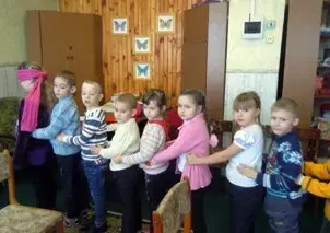 Можно составить поезд из всех участников группы и совершить поездку по выбранному маршруту. Главное условие, чтобы ни один "вагончик" во время движения не отцепился. Большой состав движется под песню "Песенка друзей".