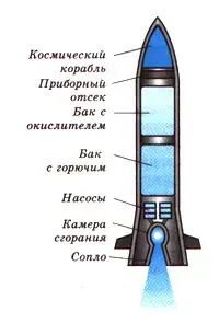 Рассмотрим ракету в разрезе рис.1 оболочка ракеты включает в себя полезный груз (космический корабль), приборный отсек и двигатель (камера сгорания, насосы и т.д.). основную массу ракеты составляет топливо с окислителем. Топливо и окислитель с помощью насосов подаются в камеру сгорания. Топливо, сгорая, превращается в газ высокой температуры и высокого давления, который мощной струей устремляется наружу через раструб специальной формы, называемый соплом. Назначение сопла - повышение скорости струи. От скорости выхода струи газа зависит скорость ракеты. Рассмотрим с помощью закона сохранения импульса. Будем считать, что ракета представляет собой замкнутую систему (не будем учитывать действие на нее силы земного притяжения). Так как до старта импульс ракеты был равен нулю, то по закону сохранения суммарный импульс движущейся оболочки и выбрасываемого из нее газа тоже должен быть равен нулю. Значит, импульс оболочки и направленный противоположно ему импульс струи газа должны быть равны друг другу по модулю. Следовательно, чем с большей скоростью вырывается газ из сопла, тем больше будет скорость оболочки ракеты.