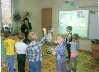Дети заходят в группу, здороваются с гостями. Встают полукругом перед интерактивной доской.