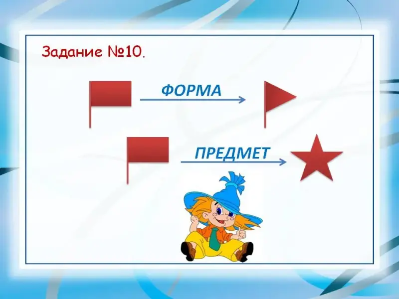 Ученики должны раскрасить все флажки красным цветом, а затем изменять только требуемые признаки. Например, требуется изменить только цвет флажка, значит, дети должны нарисовать такой же флажок, но любого другого цвета, в следующем случае изменяют только форму флажка и т.д.