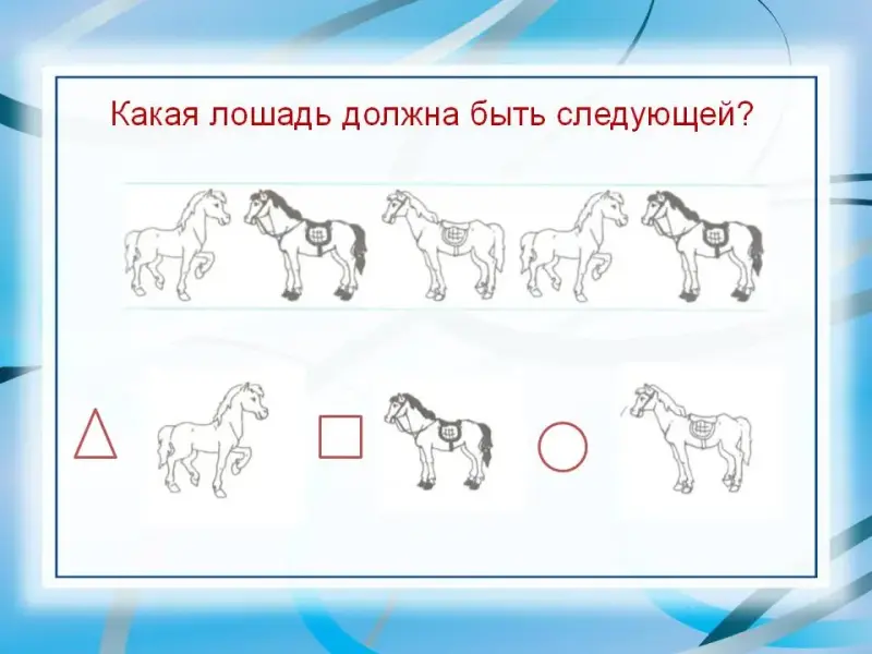 Дети должны определить закономерность расположения фигур и нарисовать следующую фигуру, сохранив эту закономерность. Определяем сначала форму следующей фигуры (круг), затем - цвет (зеленый).