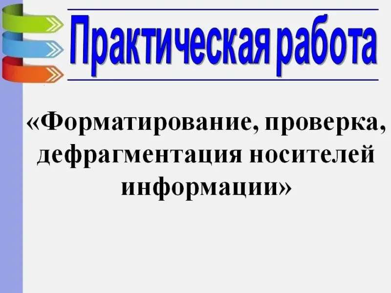 Слайд 13. Практическая работа «Форматирование, проверка, дефрагментация носителей информации»