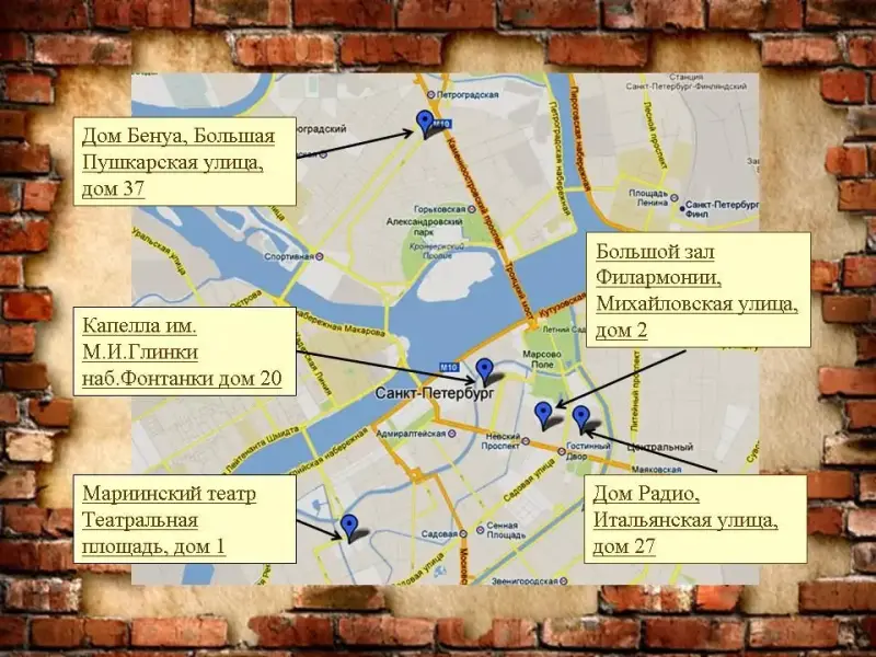 Учитель: Ну, это уже из области фантастики. Нет, ребята. Решили просить помощи у военного командования: многие музыканты были в окопах - защищали город с оружием в руках. Просьбу удовлетворили. По распоряжению начальника Политического управления Ленинградского фронта, генерал-майора Дмитрия Холостова, музыканты, находившиеся в армии и на флоте, получили предписание прибыть в город, в Дом Радио, имея при себе музыкальные инструменты. И они потянулись. В документах у них значилось: "Командируется в оркестр Элиасберга". А вот тут нам необходимо вернуться к карте, чтобы определиться со следующим пунктом нашего путешествия. (Гиперссылка на слайд №5 с картой и адресами).