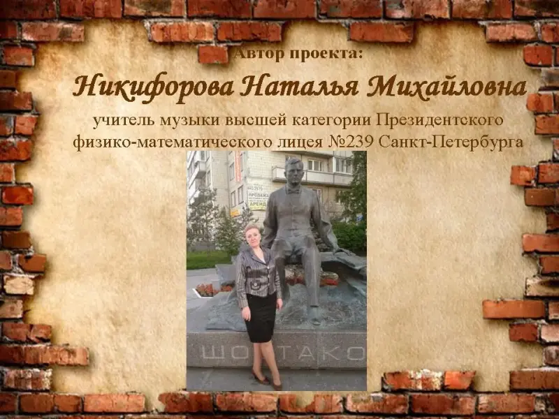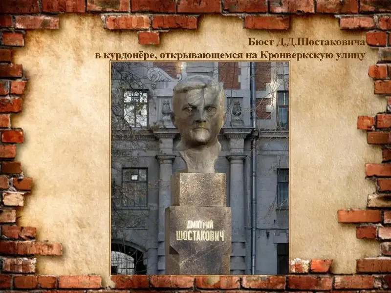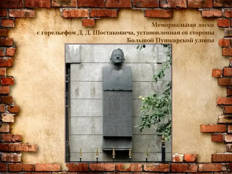 Учитель: В этом доме c 1937 по 1941 год жил великий советский композитор Д.Д.Шостакович. Об этом нам сообщает мемориальная доска с горельефом Д. Д. Шостаковича, установленная со стороны Большой Пушкарской улицы. Именно в этом доме композитором были написаны первые три части его Седьмой (Ленинградской) симфонии.