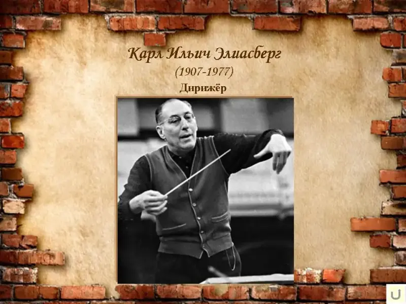 Учитель: Да, друзья мои, сохранилась запись репетиции симфонического оркестра Ленинградского Радиокомитета под управлением К.И.Элиасберга, которая была сделана в этом зале в 1967 года. Думаю, что Вы догадались и над каким произведением работал маэстро со своими музыкантами.