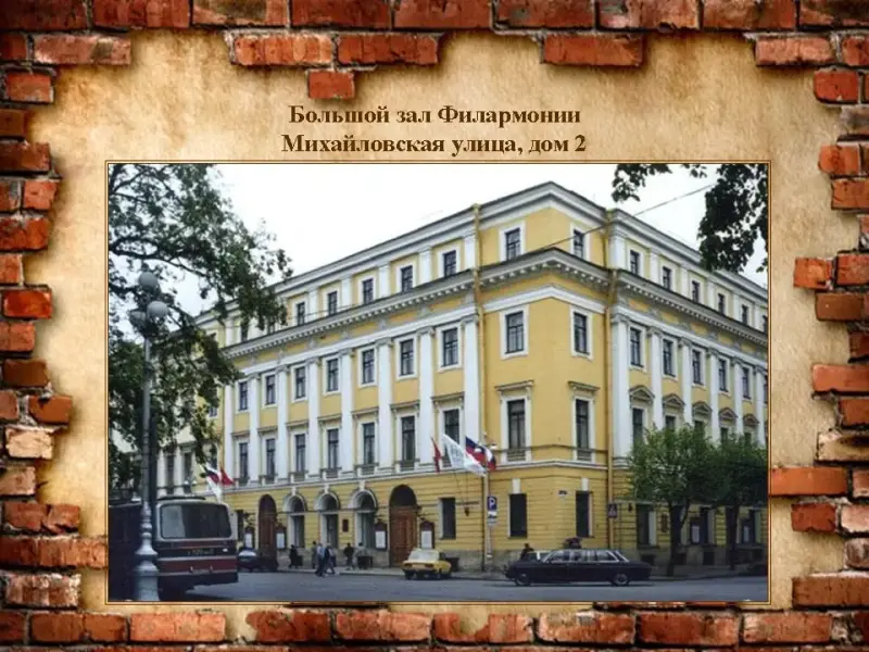 Учитель: Я приглашаю Вас в Большой зал Филармонии имени Д.Д.Шостаковича по адресу Михайловская улица, дом №2.