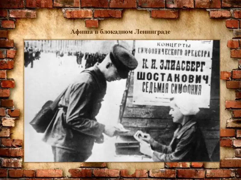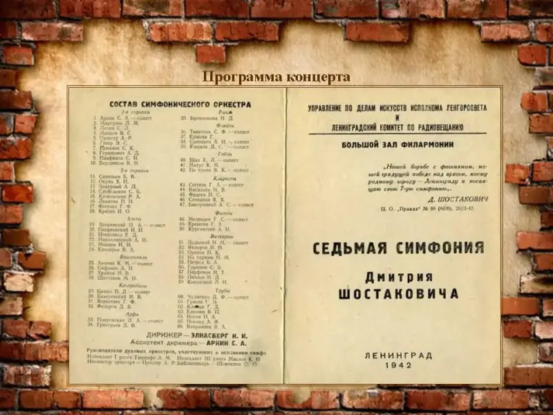 Они извещали, что 9 августа 1942 года в Большом зале Ленинградской филармонии состоится премьера Седьмой симфонии Дмитрия Шостаковича. Играет Большой симфонический Оркестр Ленинградского радиокомитета. Дирижирует К. И. Элиасберг. Иногда прямо тут же, под афишей, стоял легкий столик, на котором лежали пачки с отпечатанной в типографии программой концерта.