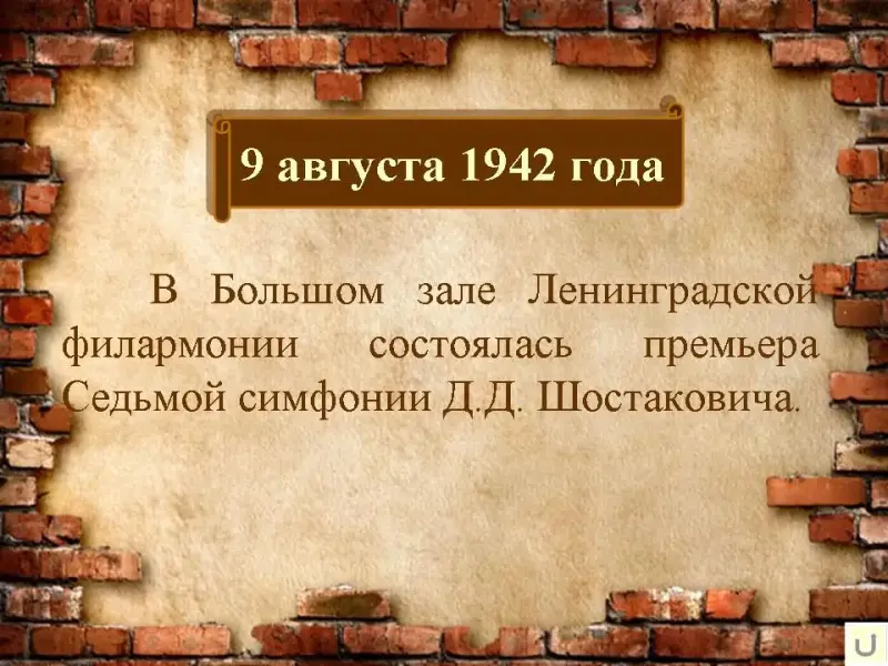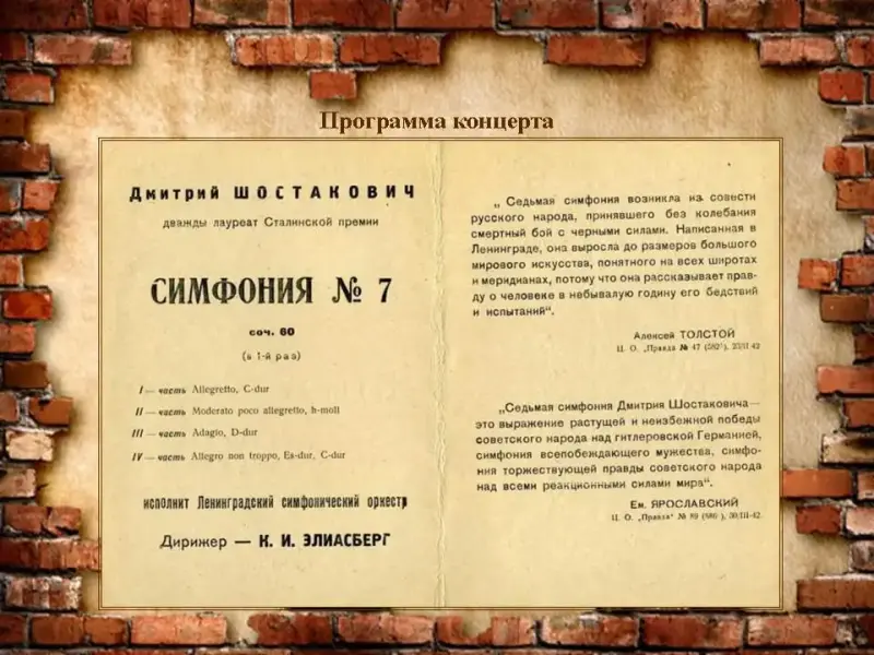 "Нашей борьбе с фашизмом, нашей грядущей победе над врагом, моему родному городу - Ленинграду я посвящаю свою Седьмую симфонию. Дмитрий Шостакович". Пониже крупно: "СЕДЬМАЯ СИМФОНИЯ ДМИТРИЯ ШОСТАКОВИЧА". А в самом низу мелко: "Ленинград, 1942". Эта программа служила входным билетом на первое исполнение в Ленинграде Седьмой симфонии 9 августа 1942 года. Билеты расходились очень быстро - все, кто мог ходить, стремились попасть на этот необычный концерт.