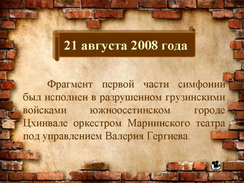 - Провести параллели с современностью: концерт симфонического оркестра Мариинского театра под управлением Валерия Гергиева в Цхинвале 21 марта 2008 года, где был исполнен фрагмент Симфонии №7 Д.Д.Шостаковича.