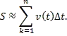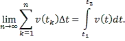 Если тело движется неравномерно в одном направлении и скорость его меняется в зависимости от времени t, т. е. v = f(t), то для нахождения пути, пройденного телом за время от до , разделим этот промежуток времени на n равных частей Δt. В каждой из таких частей скорость можно считать постоянной и равной значению скорости в конце этого промежутка. Тогда пройденный телом путь будет приблизительно равен сумме , т.е.
