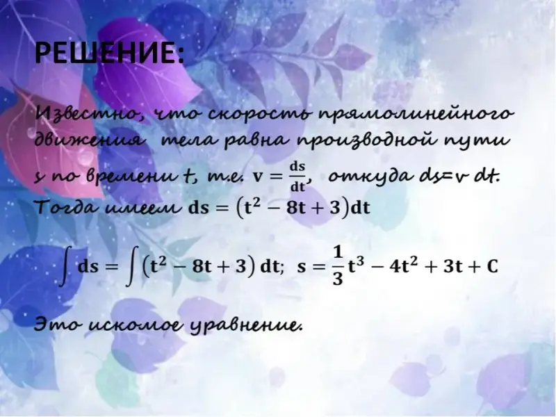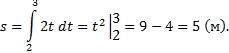 Известно, что скорость прямолинейного движения тела равна производной пути s по времени t, т.е. , откуда ds = v dt. Тогда имеем
