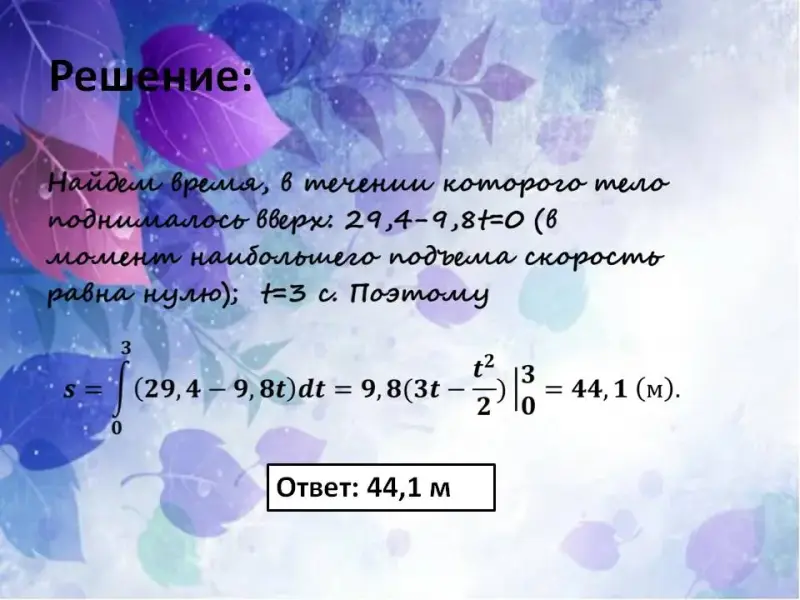 4) Тело брошено вертикально вверх со скоростью, которая изменяется по закону м/с. Найти наибольшую высоту подъема.