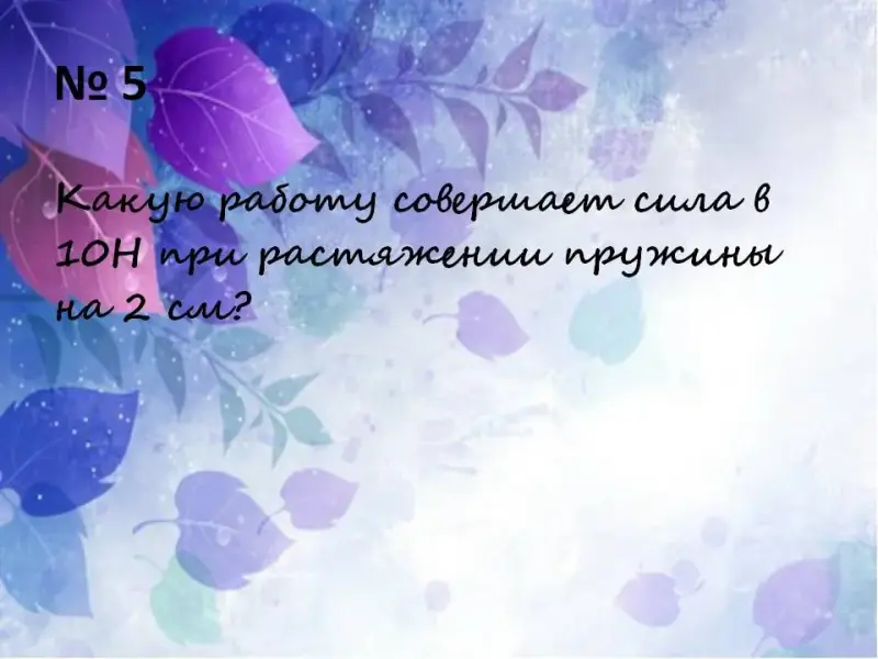 5) Какую работу совершает сила в 10Н при растяжении пружины на 2 см?