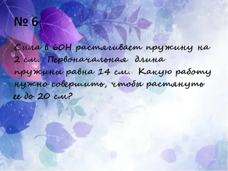 6) Сила в 60Н растягивает пружину на 2 см. Первоначальная длина пружины равна 14 см. Какую работу нужно совершить, чтобы растянуть ее до 20 см?