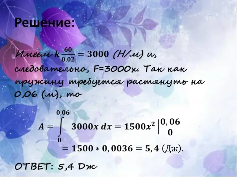 Имеем (H/м) и, следовательно, F=3000x. Так как пружину требуется растянуть на 0,06 (м), то