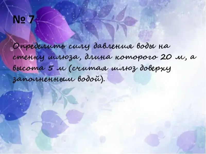7) Определить силу давления воды на стенку шлюза, длина которого 20 м, а высота 5 м (считая шлюз доверху заполненным водой).