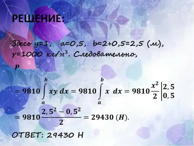 10. Вычислить силу давления воды на вертикальную прямоугольную пластинку, основание которой 30 м, а высота 10 м, причем верхний конец пластинки совпадает с уровнем воды.