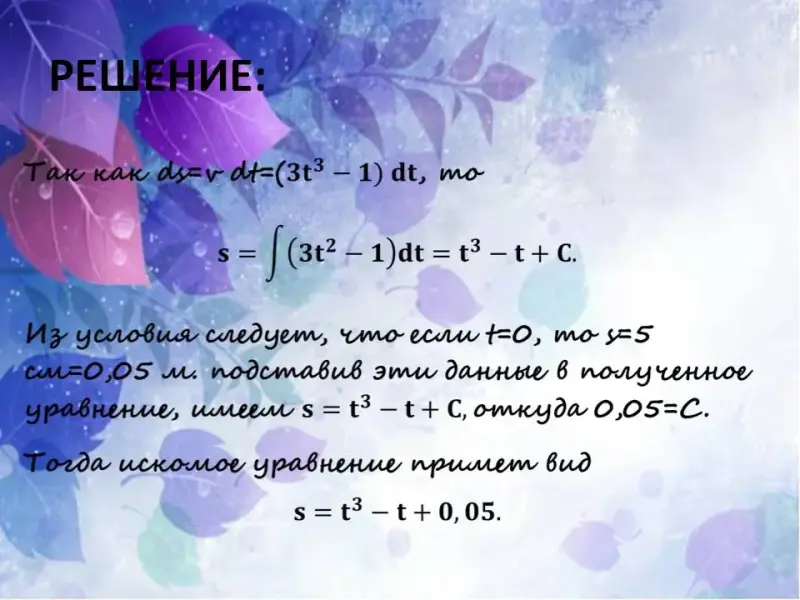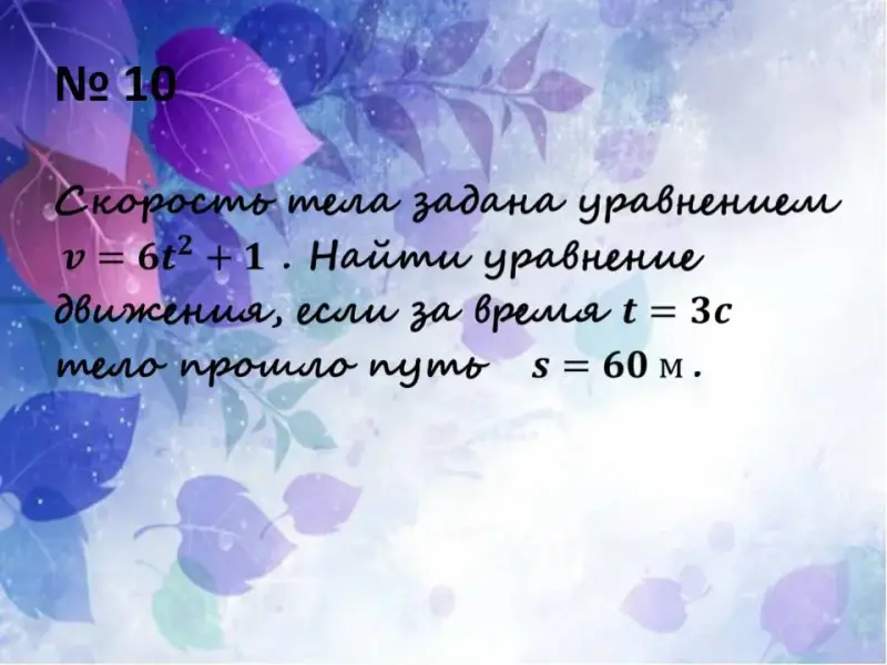 11) Тело движется со скоростью м/с. Найти закон движения s(t), если в начальный момент тело находилось на расстоянии 5 см от начала отсчета.