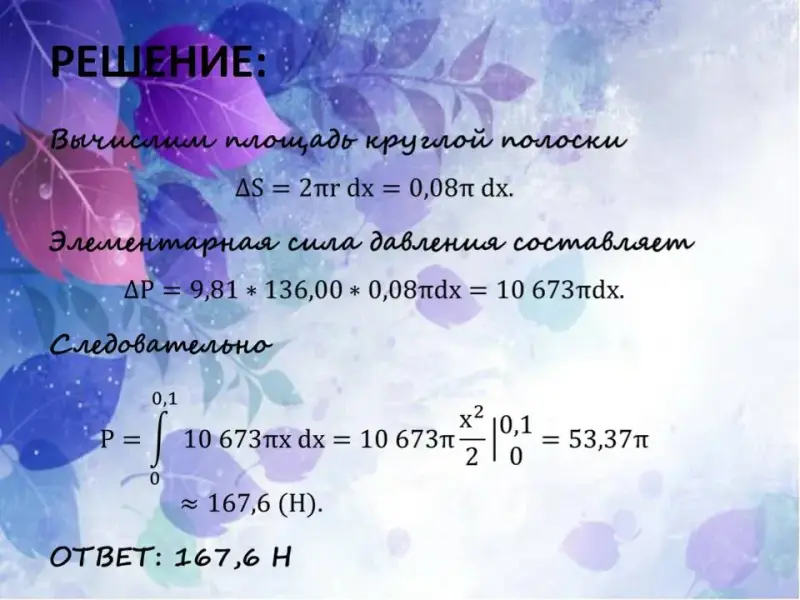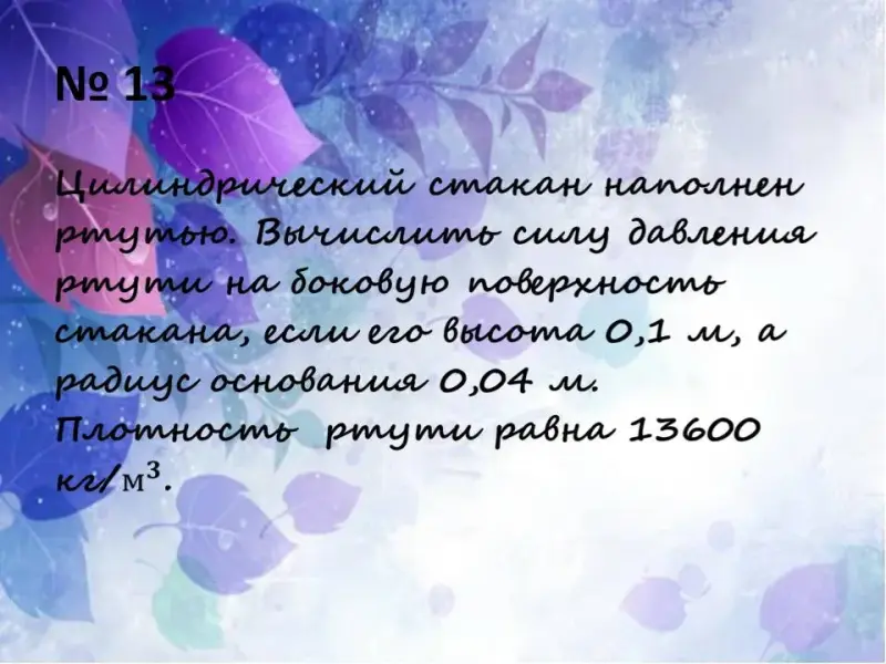 13) Цилиндрический стакан наполнен ртутью. Вычислить силу давления ртути на боковую поверхность стакана, если его высота 0,1 м, а радиус основания 0,04 м. Плотность ртути равна 13600 кг/.
