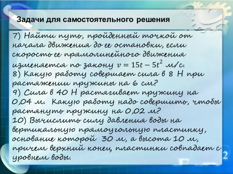 Так, понятие определенного интеграла применяется при решении задач на вычисление работы переменной силы, давления жидкости на вертикальную поверхность, пути, пройденного телом, имеющим переменную скорость, и ряд других.
