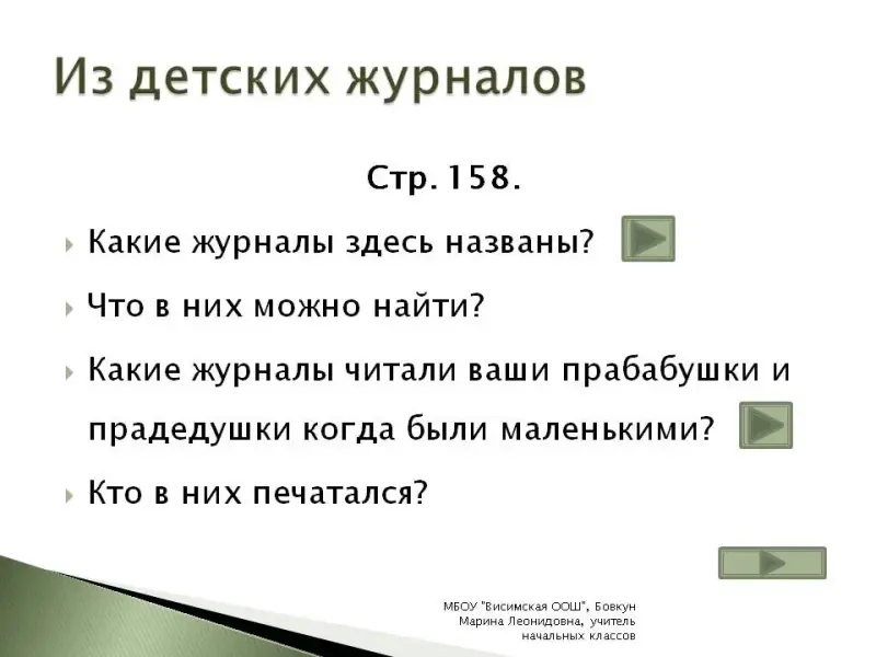 | V. Применение нового знания (14 мин.) | Тренировка навыков работы с детскими журналами. |