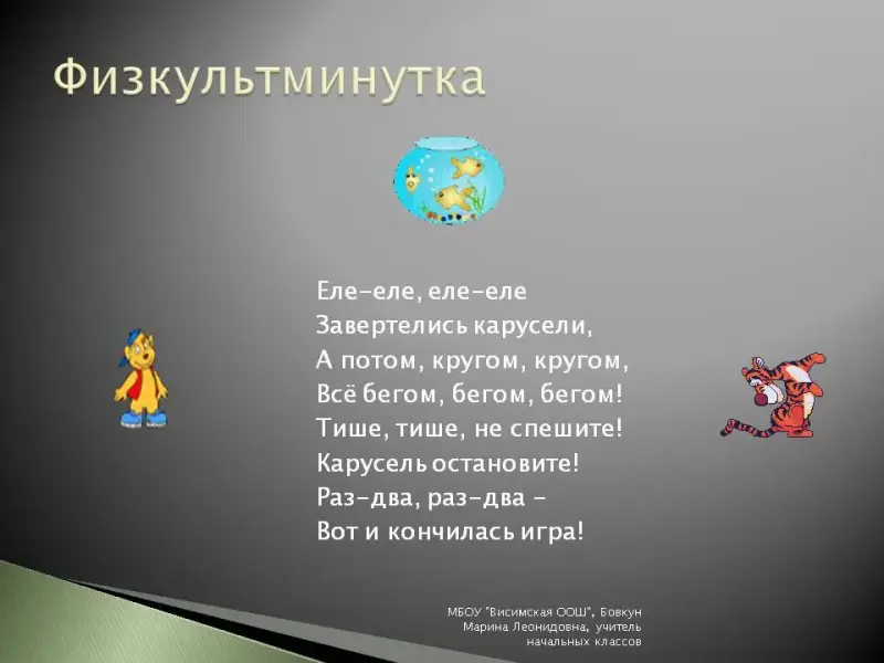 | Физкультминутка (1 мин.) | Снятие мышечного напряжения, зрительной усталости. | Еле-еле, еле-еле