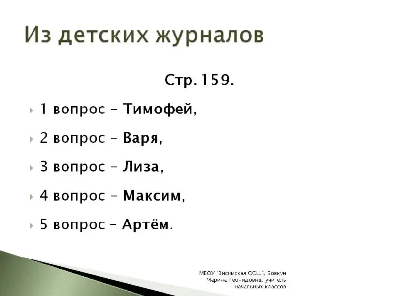 1) - В учебнике на стр. 159 есть несколько вопросов. На 1 вопрос даст ответ Тимофей, на 2 - Варя, 3 - Лиза, 4 - Максим, 5 - Артём.