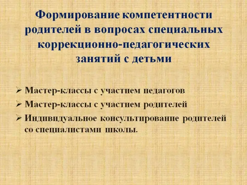 | Формирование компетентности родителей в вопросах специальных коррекционно-педагогических знаний и их применение в занятиях с детьми | - повышение педагогической грамотности родителей;