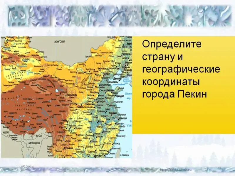 Следующий город нашего путешествия. Обратите внимание желтый флаг, это значит он расположен в Азии. Определите страну и географические координаты города Пекин Слайд 21 Страна Китай, географические координаты города Пекин 39о сш; 116о вд Оценивает работу каждой команды, выставляет баллы за выполнение задания. |