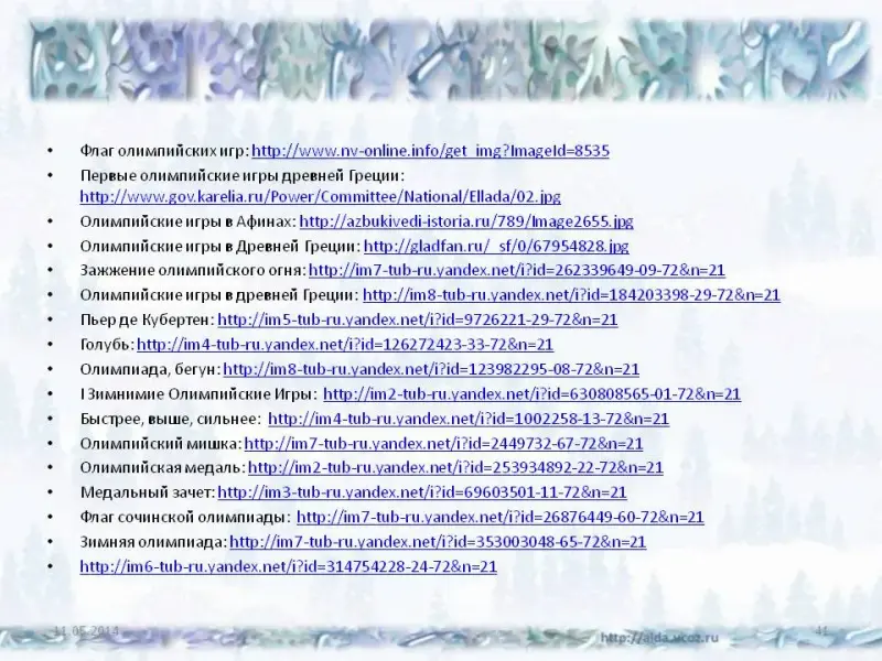 | 3. Просмотр презентации | Слайды 1, 2: Возникновение олимпийских игр. В 776 году до н.э. Олимпийский праздник получил общегреческое признание. Этот год явился первой летописной страницей Олимпийских игр | Ребята смотрят презентацию |