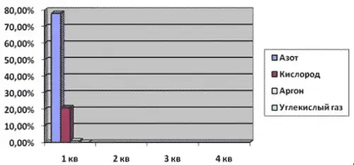 Азот займет сектор в 281,2°, кислород - 75,5°, аргон- 3,4°. аргон- 3,4°,углекислый газ-0,2°,