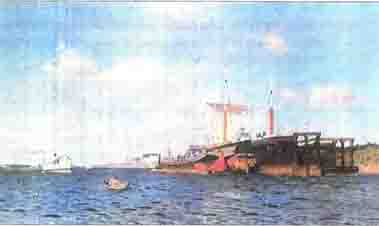 - Видим что и в каких красках? (Пароход, маленькую лодку, баржу).
