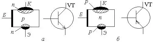 Независимо от структуры транзистора его пластинку исходного полупроводника называют базой (Б), противоположную ей по электропроводимости область меньшего объема - эмиттером (Э), а другую такую же область большего объема - коллектором (К). Эти три электрода образуют два p-n перехода: между базой и коллектором - коллекторный, а между базой и эмиттером - эмиттерный. Каждый из них по своим электрическим свойствам аналогичен p-n переходам полупроводниковых диодов и открывается при таких же прямых напряжениях на них.