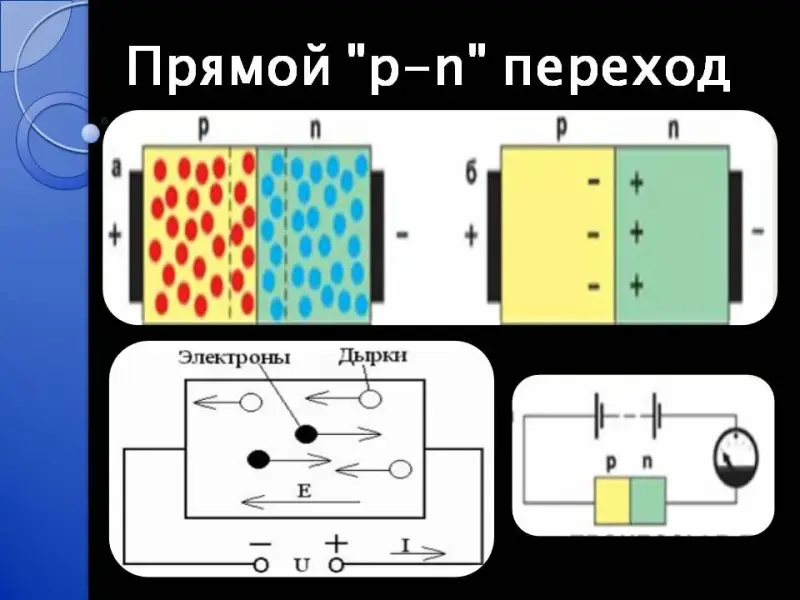 При прямом (пропускном) направлении внешнего электрического поля электрический ток проходит через границу двух полупроводников.